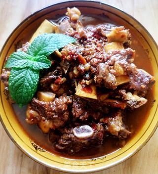 4. 炖牛排骨:将腌制好的牛排骨放入锅中,加入适量的清水和调料,大火烧开后转小火慢炖。待汤汁浓稠,排骨熟透即可。